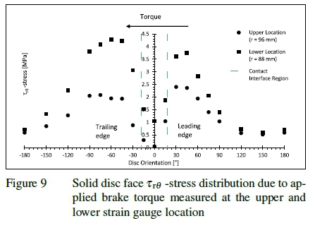 On either side of the disc/pad contact interface region, the shear stresses reached similar values; at the upper location (denoted by circles) the shear stress at 45° (leading edge) is 2.36 MPa as compared to the shear stress at -45° (trailing edge) of 1.94 MPa, thus 21% greater. In contrast at the lower location (denoted by squares) the shear stress at 45° (leading edge) is 3.74 MPa as compared with the shear stress at -45° (trailing edge) of 4.22 MPa, thus 11% less. The shear stresses interestingly decrease at an orientation much further away from the disc/pad interface region on the trailing edge side as compared to the leading edge side; the steepest gradient of decrease is at -120° on the trailing edge side as compared with 75° on the leading edge side. While no convincing argument is advanced for the cause of these asymmetries, the asymmetry is in agreement with the finite element analysis results of Abu Bakar et al. [29]. Their measurements of the disc/pad contact pressures when a brake rotates were also asymmetric; higher on the leading edge of the contact interface compared with the trailing edge. Their results show that the leading edge between the pad and disc maintains contact but the trailing edge loses contact [30].