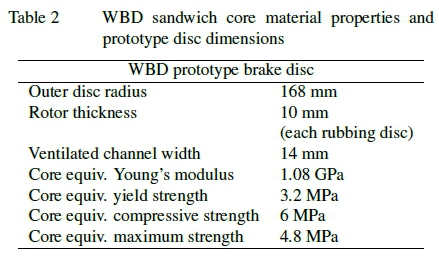 The sandwich core of the WBD brake disc is shown in figure 2 and the cross-section of the WBD brake disc with key dimensions is shown in figure 10. The WBD core is sandwiched between the two solid rubbing surfaces. The disc dimensions and equivalent material properties of the WBD prototype brake disc are shown in table 2. The dimensions of the WBD brake disc are similar to the solid brake disc as both discs are to be fitted on the same vehicle, the Mercedes-Benz Atego.