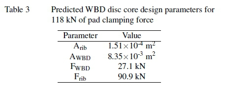 The WBD ventilated core thickness (sandwiched between the two rubbing surfaces in figure 10) is 14 mm. The reinforcing ribs are thus required to be 14 mm in height. Figure 11 shows the WBD disc core reinforced with the solid rib material sandwiched between the WBD material. The compres-sive pad force is transferred through the rubbing surface to the core. Referring to figure 11 and figure 12, the compressive pad force of 118 kN is supported by both the WBD and rib material, generating the FWBD and Frib internal forces respectively. Since the stresses are assumed to be concentrated in the disc/pad contact interface, only the pad area is considered for the reinforcement.