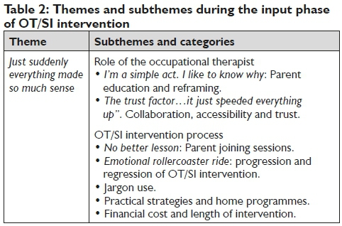 The theme Just suddenly everything made so much sense emerged from data analysis and describes the progression of the participants' perceptions and experiences during the intervention or "input" phase. (See Table II page 47) Data analysis identified two subthemes that catalysed expansion in most participants' understanding. These included: the role of the occupational therapist and the OT/SI intervention process.