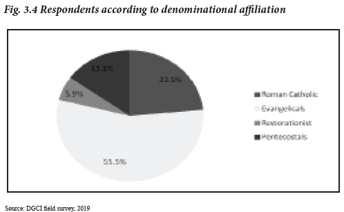 To get a picture of the denominational affiliation of the respondents was crucial since that proved beyond doubt that a big area of the Christian denominations in the country were reached; and as such, when we talk of the Church in Tanzania, that is reflected from the representativeness of the respondents. Once again for the sake of merging the existing diversities in denominations, I stratified denominations into groups according to their theological classifications. In this respect I came up with four classes as follows, 1. Roman Catholic, 2 Evangelicals, 3 Restorationist, and 4 Pentecostals.5 Interestingly, all the four categories were represented, thereby giving me confidence that results would not be biased in any way. The outcome for this demographic phenomenon is as depicted in figure 3.4 below.