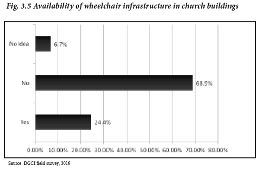 Out of all the 16 congregations I visited, in fact all of them within the city, not one congregation or church building had the wheelchair pavement. Equally, all the pastors I interviewed admitted that as a blind spot in their foresight for building design. However, all the church buildings that I observed had wide enough entrances to accommodate entrance of wheelchairs freely. Results from a quantitative side as given in figure 3.5 below can give us a glimpse on the state of affairs on a wider scope.