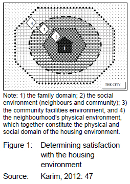 This article specifically explores the intersection between QOL and housing satisfaction through objective measurements. People's experiences of the built environment (and its characteristics) also improve or worsen their living conditions (Gulyani & Bassett, 2010: 2202). The interaction between objective and subjective QOL measures results in four possible housing-satisfaction outcomes: well-being, dissonance, adaptation, and deprivation. Residing in luxurious accommodation is generally associated with greater levels of 'well-being'. 'Dissonance' is experienced when people are dissatisfied with their living conditions, even though they are adequate. 'Adaptation' indicates the opposite effect, i.e., people are satisfied with their living conditions, even though they are inadequate. 'Deprivation' implies having poor living conditions and believing they are poor (Karim, 2012: 46). Chronic dissatisfaction and deteriorating living conditions will occur if people are dissatisfied with their homes and built environment but are unable to move or alter their situation, due to limited resources and/or money (Ukoha & Beamish, 1997: 446). Various factors influence people's satisfaction with their homes and the built environment (Gulyani & Bassett, 2010: 2202). Overlapping physical and social domains influence housing satisfaction through a cause-and-effect relationship: the physical domain comprises the house, infrastructure, community and recreational facilities, and the neighbourhood's physical environment; the social domain includes family, neighbours, and the local community. The interaction between these domains often determines people's satisfaction with their living conditions (Figure 1) (Karim, 2012: 47-48).
