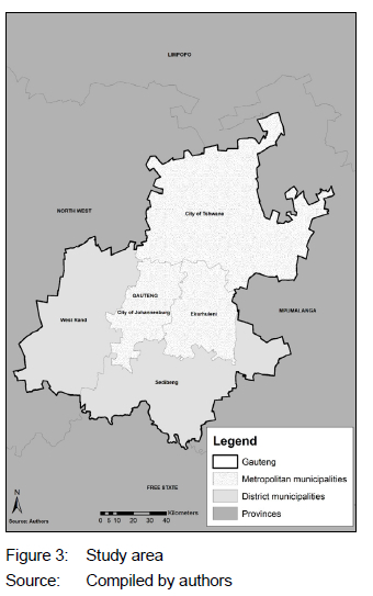 Gauteng is the smallest province in South Africa, with a total land area of only 18,170km2 comprising three metropolitan municipalities (the CoJ, CoT, and EMM) and two district municipalities (Sedibeng and West Rand) (Figure 3). Gauteng comprises the largest urban agglomeration in the country with the strongest economic hub focusing on trade, commerce, and industrial development (Gotz, Wray & Mubiwa 2014: 43). Gauteng's metropolitan municipalities were selected because they contribute significantly to the South African economy (Alexander, 2018).