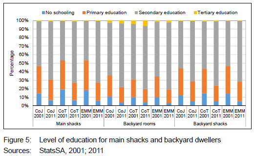Given South Africa's racially based past, it is not surprising that approximately 95% of people in all three dwelling types in all the municipalities were Black in both years. The White urban poor who mostly resided in backyard rooms in 2001 possibly moved to formal dwellings in other neighbourhoods (Gaibie & Davids, 2009: 5; Turok & Borel-Saladin, 2016: 399). Men migrate mostly in search of better living conditions (UN-Habitat, 2003: 216), and thus reside mostly in the three dwelling types in all the municipalities. Overall, 68% of men occupied mostly backyard shacks (2001), while 74% and 79% of men in the CoJ and EMM, respectively, resided in main shacks (2011). Conversely, women resided mostly in main shacks in 2001 in all the municipalities, but a third stayed in backyard rooms in 2011.