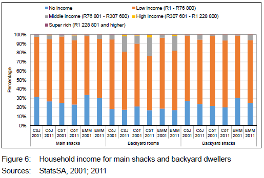 People were predominantly employed in all the dwelling types and municipalities, with increasing percentages in 2011. Roughly three-quarters resided in backyard rooms in all the municipalities (2001 and 2011). Although the percentage of the unemployed declined significantly from 2001 to 2011 in all the dwelling types and municipalities, main shacks remained the most prevalent. Occupants of all the dwelling types and municipalities lived mostly in extreme destitution in 2001 and 2011; approximately 60%-78% of households had a low-income (R1-R76 800) (Figure 6). Interestingly, despite this, they resided mostly in backyard rooms in the CoJ and EMM (the most expensive housing option of the three) and in backyard shacks in the CoT in 2001. This pattern changed drastically in 2011 as the CoJ experienced a 12.19% drop, while the CoT had a 9.44% decline, and EMM decreased by 12.31%. Conversely, backyard shacks became more prominent among the low-income group in all the municipalities in 2011. Albeit lower percentages, middle-income occupants also resided mostly in backyard rooms, owing to higher education and income levels (Crankshaw et al., 2000: 849; Govender et al., 2011: 335). Main shacks were mostly occupied by tenants with no household income in all the municipalities (2001 and 2011).