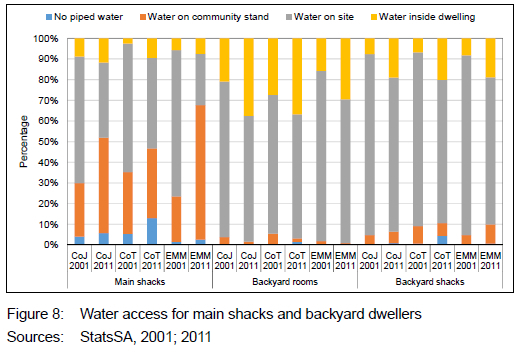 Main shacks generally experienced the worst service-delivery situation (water, energy sources for cooking, heating, and lighting, refuse removal, and sanitation) in all the municipalities, while backyard rooms had the best service delivery. This is attributed to backyard rooms being formal housing structures (Lemanski, 2009: 474), while main shacks are constructed in inaccessible dangerous areas (Govender et al., 2011: 339, 341). These areas lack the infrastructure (Turok & Borel-Saladin, 2016: 389, 391) to supply clean drinking water (Gaibie & Davids, 2009: 17) and sanitation services (Lemanski, 2009: 482). Illegal electricity connections and communal refuse removal also create dangerous and unhealthy living conditions (Darkey & Visagie, 2013: 304; Oldewage-Theron et al., 2005: 25; Richards et al., 2007: 381; Westaway, 2006: 183-184).