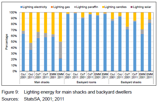 Backyard rooms and shacks were more inclined to use electricity as a form of lighting in 2001 and 2011 in all the municipalities (Figure 9), while candles and paraffin were more popular among residents in the main shacks, and to a lesser extent for backyard shacks. Likewise, backyard rooms and shacks used electricity mostly tor cooking and heating purposes in all trie municipalities in both years, while roost main shacks cooked with paraffin. Main shacks mainly used coal for heating in all the municipalities in 2001, and candles for lighting in 2011.