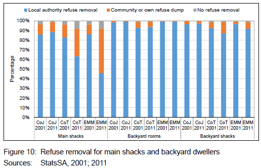 The local authority generally removed the refuse from all the dwelling types and municipalities in 2001 and 2011 (Figure 10). In the CoT and EMM, both types of shacks, but main shacks in particular, experienced substantial decreases in the removal of their refuse by the local authority in 2011. This increased the creation of community or personal refuse dumps near the dwellings, while in other instances the refuse was not even removed.