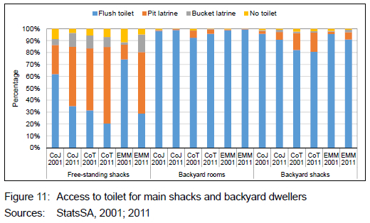 Over 90% of backyard rooms used flush toilets in all the municipalities, and the percentages increased in 2011 (Figure 11). Backyard shacks also predominantly used flush toilets, but percentages generally decreased by roughly 5% in the CoJ and EMM in 2011. Main shacks experienced significant decreases in the usage of flush toilets across all the municipalities in 2011, with sharp increases in the usage of pit latrines. Bucket latrines were more prevalent among main shacks, especially in EMM in 2011, while the nu mber of main shacks with no access to toilets increased slighfly in the (CoT in 2011.