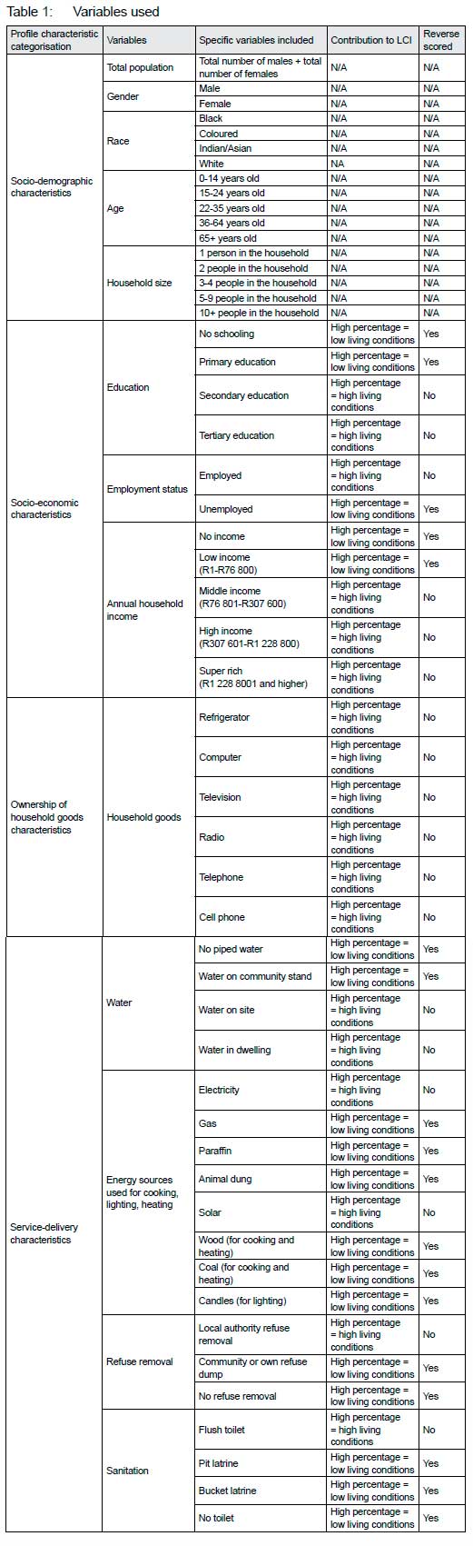 To achieve the second objective, the variables were categorised as either positively or negatively contributing to people's living conditions (i.e., in the case where higher percentages would result in improved living conditions, the variables were scored as 'high percentage = high living conditions', and vice versa for deteriorating living conditions - 'high percentage = low living conditions') (Table 1). To accommodate the difference in the interpretation of higher percentages (i.e., it can result in improved or deteriorating living conditions), the 'high percentage = low living conditions' were reversed scored. The aim of reverse scoring is thus to 're-code' the responses so that a high score is transformed into the corresponding low score on the scale. The means were calculated for all the main places across all the applicable variables to obtain an average LCI score per main place for 2001 and 2011.