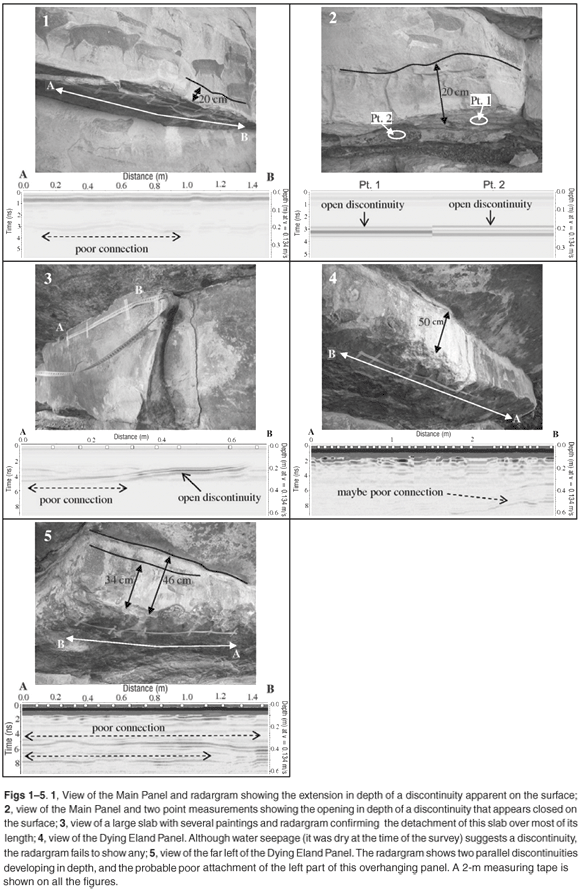 WE PRESENT THE RESULTS OF A SURVEY of the main panels of Game Pass Shelter, a major painted rock art site in the KwaZulu-Natal Drakensberg mountain range, using ground penetrating radar. The investigation depth in the Clarens Formation sandstones lies between four and 80 cm, adequate to determine whether the rock wall presents any potentially unstable discontinuities. By identifying such areas and determining the depth of alteration zones at the major discontinuities, the radar helps in the precision mapping of the state of conservation of the rock art panels. The best results are obtained when discontinuities consist of thin clayey layers and are saturated with infiltrating water or are open widely. The radar analysis demonstrated the major role of the thin clayey sedimentary joints as potential source of instability and damage to the art. Thus, non-destructive and technically simple ground penetrating radar is especially useful for the investigation of the stability of rock art sites.