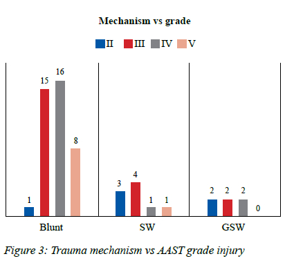 Diaphragmatic grade III injury occurred in 21 patients (38%), grade IV in 19 (34%), grade V in nine (17%) and grade II in six (11%) In SW, grade III injury was the most common, followed by grade II. In GSW, grades II, III, and IV had proportionally equal cases. In BT, grade IV was the most common, followed by grade III BT (Figure 3).