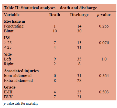 The overall mortality rate was 20% (n = 11). Mortality was similar for left- and right-sided TDH. The statistical analyses are shown in Table II.