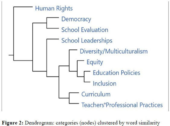 Pearson's correlation coefficient for word similarity identified the category "Human Rights" as an outliner, being an isolated branch and not coupled with any other category. The categories "Democracy" and "School Evaluation" (p = 0.713) were coupled together on the same branch, while "School Leadership" was coupled with all the remaining categories, though with different proximity values. "Curriculum" and "Teachers' Professional Practices" (p = 0.811) were strongly correlated, although the categories more strongly correlated were "Diversity/Multiculturalism" and "Equity" (p = 0.884), "Education Policies" and "Equity" (p = 0.932) and "Education Policies" and "Inclusion" (p = 0.952).