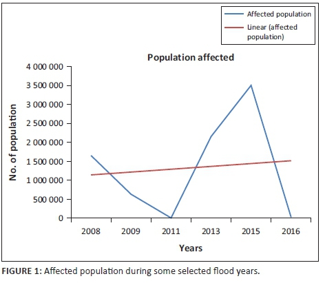 The damage caused by floods during the period 2008-2016 revealed that maximum damage occurred in the year 2008, 2009, 2013 and 2015. The damage caused by floods in these 4 years brought immense misery to the people of the district. The population most affected by heavy rain and flood water discharge from different dams was in 2015 and it has been estimated to be 35 lakhs (see Figure 1) as per report of the Disaster Management Department, which supersedes all other damages recorded earlier. In 2015, the flood damage occurred over 3200 km2 of area and 90 374 ha of crop area (see Figure 2) were damaged. It has been estimated that 56 214 houses were fully and 211 411 houses were partly damaged by the 2015 flood. It was also estimated that 11 267 villages were affected and 13 persons died besides a large number of cattle population. Thus, the damages occur in several forms. The agricultural lands with standing paddy plants remain completely submerged for several days in low lying areas. Human habitation and crops are washed away by strong currents, causing numerous breaches across the roads and embankments. Communication links get dislocated and damaged. The researcher extensively visited different places of the district to have a picture of the catastrophic flood of 2015. Some people who had experiences to witness several floods in the district liked to opine that such floods had not occurred in the district during the last two decades. So, in the present context it is an important matter to identify the flood hazard zones and precautionary measures should be taken in the high flood hazard zones.