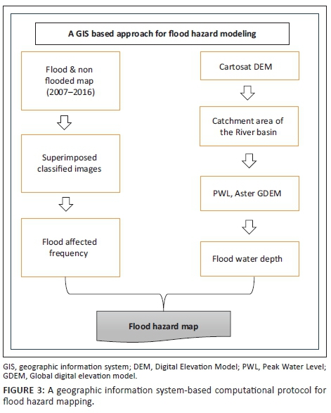 The adopted methodology of this study is shown in Figure 3, which shows the flowchart for the development of a flood hazard map. The various steps are involved in the following manner. Firstly, the flood inundation map from 2007 to 2016 has been collected from the National Remote Sensing Centre, Bhuvan, a geo-platform of the Indian Space Research Organisation. River Peak Water Level (PWL) data have been collected from the Irrigation and Waterways Department of West Bengal. Secondly, for demarcation of the river basin area, Digital Elevation Model (DEM) was derived from Bhuvan. Thirdly, to determine the flood-affected frequency map, flood inundation maps from 2007 to 2016 have been used (see the 'Flood frequency analysis' section) and to determine the flood water depth map, DEM and PWL of the major rivers have been used (see the 'Flood water depth analysis'section). Finally, the flood hazard map has been developed by considering both the flood-affected frequency map and flood water depth map (see the 'Flood hazard map preparation' section).