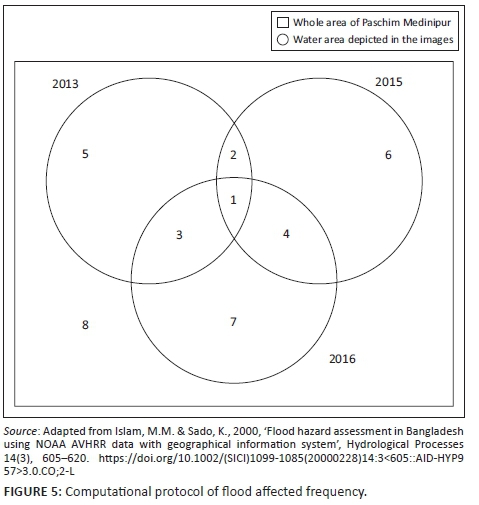 When the inundated area is found in all three images, then it is identified as the worst affected area and hence it is the most vulnerable zone. The inundated identical area when found in two out of three images is identified as the medium to low affected area. If in any of the images inundated areas are not found, then this is classified as a non-flooded area (Figure 6). The final map of flood-affected frequency has been reclassified again into four types as per the intensity of inundation, assembling to flood rankings order class 1, class 2, class 3 and class 4 as no-flood, low flood, medium flood and high flood hazards areas, respectively.