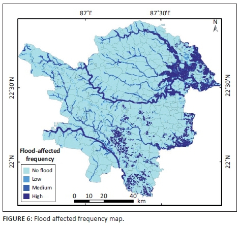 The flood-affected frequency map revealed that around 12% of the study area in the worst affected area is prone to regular inundation. Around 80% of the study area falls under non-flood category and around 8% of the area has been subjected to medium to low flood categories.