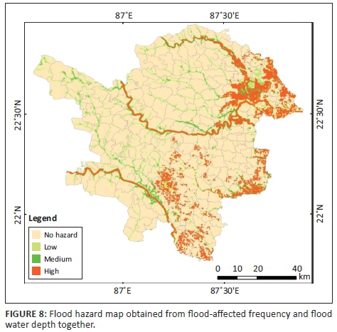 Geospatial techniques, particularly Remote Sensing (RS), are the most reliable techniques for the assessment of flood hazard (McKean, Buechel & Gaydo 1991). The final hazard map has been derived from combining the flood-affected frequency maps and flood depth maps. If a cell marks non-flooded in both maps, then it has been regarded as a non-hazard zone. If a cell represents low flooded areas in flood-affected frequency map and shallow flood water depth in flood water depth maps, then it is regarded as a low hazard zone. If a cell represents medium flooded areas in flood-affected frequency map and medium flood water depth in flood water depth maps, then it is regarded as a medium hazard zone. And then if a cell represents deep flood water in flood water depth maps and high flood areas in flood-affected frequency map, then it is regarded as a high hazard zone.