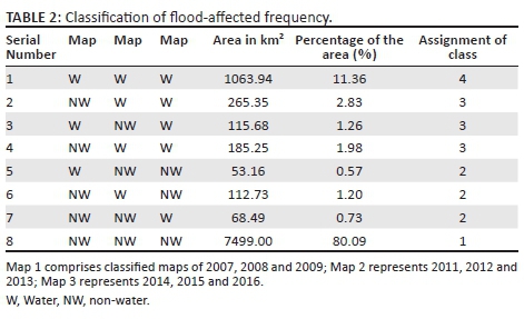 The notion of the frequency of flood has been adopted from Islam and Sado (2000). The water and non-water areas have been classified from 9 year images and superimposed for generating a map that can record the frequency of flood (see Table 2). Firstly, the classified image of 2007, 2008 and 2009 has been associated to formulate an individual flood frequency map. The method is followed throughout the year. By this method, a three-flood compass map has been prepared. And this three-flood frequency map is assembled to formulate a flood-affected frequency map (see Figure 5).