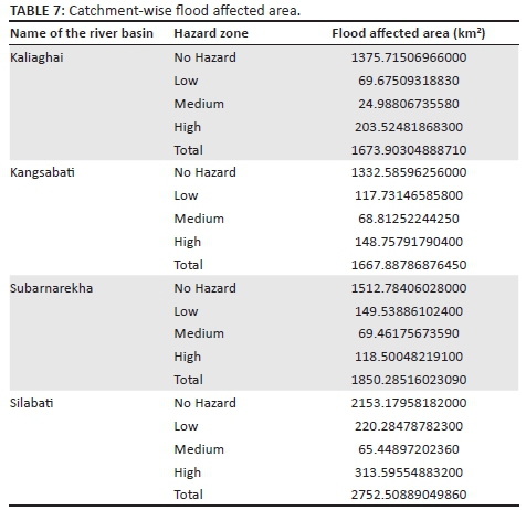 On the basis of hazard intensity, again the flood hazard map has been reclassified into four types: class 1, class 2, class 3 and class 4 as no hazard, low hazard, medium hazard and high hazard zone, respectively (see Figures 8,9,10). The final flood hazard map was incorporated with population and housing data of 2011 census to assess the vulnerability of these two components to flood hazard. Table 5 presents the distribution of population and Table 6 reveals the distribution of housing units in different flood hazard zones. In Silabati river catchment, high flood hazard area is maximum, approximately 313.60 km2, and in Subarnarekha river catchment it is minimum at approximately 118.50 km2 (see Table 7).