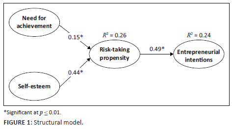 In accordance with the validated measurement model, a structural model was then specified to test the hypothesised paths that university students' risk-taking propensity mediates the influence of their need for achievement and level of self-confidence on their entrepreneurial intentions. The statistical significance level was set at p 0.01 throughout.