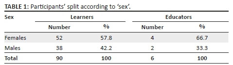 To seek answers to research Question 2, educators who taught Setswana at the three high schools were approached to participate in the study. Six of them (i.e. two from School A, three from School B and one from School C) agreed to participate in the study, and duly signed 'information letter and informed consent forms'. The study's sample population was 96 participants, that is, 90 learners and 6 educators. Table 1 shows their split according to 'sex'.