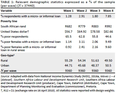 As seen in Table 1, there is a significant increase from 2008 to 2015 in the share of the population engaging in the M&IL market from 1.3% to 7.9%, although there was a minor decrease in wave 3. This finding of increased dependence on M&ILs holds for each of the cohorts of interest - 'poor females' and 'poor females residing in rural areas'. The rate of increase in M&ILs among the poor cohorts compared to the whole sample is 3.5% higher on average. This higher level of activity by the poor could be interpreted as a higher number of individuals accessing the only financial service they are able to. This tendency to rely on loans is not uncommon in South Africa, with household debt as a percentage of nominal disposable income persistently remaining at high levels of more than 70% over the last decade (SARB 2019).
