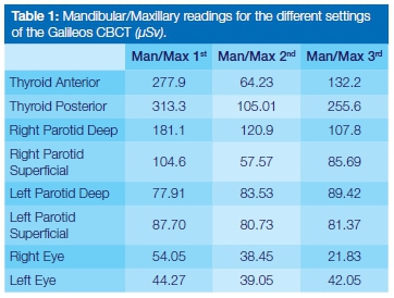 Radiation received is cumulative throughout life.15 It is therefore essential to reduce the number of radiographs taken and to choose the most appropriate imaging modality. The International Commission on Radiological Protection (ICRP) provides tissue-weighting factors, which represent the relative contribution of that organ or tissue to the overall risk.16 Salivary glands, thyroid gland and eyes are the most susceptible to radiation in the head and neck region. Tissue-weighting factors were not taken into consideration by the authors as the purpose of this study was to accurately measure and compare doses using different settings of the Galileos CBCT machine.