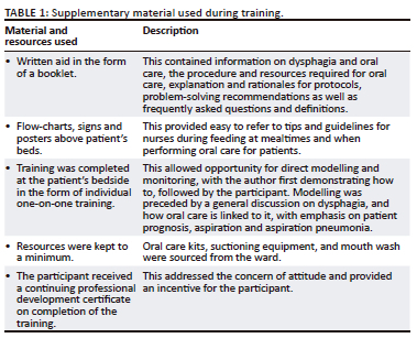 This training format addressed the requirements of the context, and was acceptable to hospital managers, nurse managers, and nurses. The materials used in the training, that is, the posters, booklet on oral care and pictures (all developed by the author specifically for the intervention) as well as the resources used, that is, gauze, forceps and mouthwash solution, were acceptable to the nurses and available within the wards. Adapting to the needs of the context supported the K2A model and contributed towards sustainability of the intervention, that is, oral care training. It also facilitated capacity building for nurses with maintenance of skills for use with all patients after completion of the study. Following consent from the patient and nurse, training was conducted at the patient bedside. The trained nurse subsequently implemented oral care (Appendix 1: Oral care protocol) until patient's discharge.