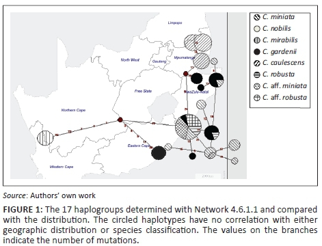 According to the 'best match' and 'all species barcodes' option in SpeciesIdentifier, correct species identifications are 37.33% and 12.0%, respectively (Table 3); incorrect Clivia identification can be as high as 10.66% when using the 'best match' option. The non-variable sites were removed from the sequences, and a network was constructed in Network 4.6.1.1 (Figure 1) with 67 specimens clearly belonging to a species (in other words excluding specimens classified as Clivia 'aff.' specimens) in the data set resulting in 17 haplotypes.