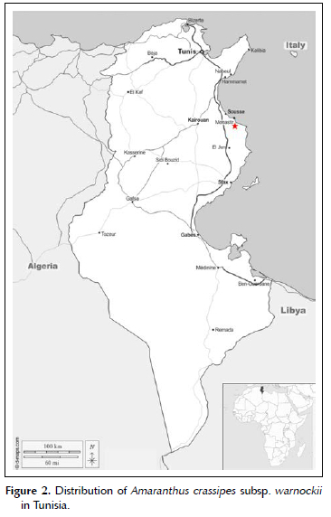 CONCLUSION: Amaranthus crassipes subsp. warnockii is an alien species in Tunisia, growing in human-made habitat on clayey and sandy substrates within ruder-al vegetation where it can be considered a casual. We hope that in the future continuous monitoring of the population will take place, to verify the possible naturalisation and spread of this taxon in Tunisia. If the latter happens, actions for eradication of the plants are needed
