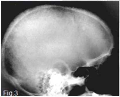 A diagnosis of secondary hyperparathyroidism was made. Her blood picture at the time was as follows: serum calcium within normal limits, urea increased 7-fold, creatinine 13-fold and alkaline phosphatase 7-fold. The pantomograph (Fig. 2) shows generalized relative rarefaction of the jawbones and absence of the lamina dura around the teeth giving the roots a tapered appearance. A unilocular radiolucency (red arrow) is discernible distal to the lower left 2nd molar tooth in the mandible, suggestive of a brown tumour. The skull radiograph (Fig. 3) shows a generalized granular appearance. The radiopaque outlines of the maxillary sinus are not discernible. (Figs 2 and 3). Figure 4 shows granularity of trabecular pattern in bones of the hand and wrist and subperiosteal erosion of the cortex (green arrow), especially in the mid phalanges, and erosion of the terminal tufts (yellow arrow).A biopsy specimen was taken from the mandibular radiolucent area. Microscopic examination revealed a cellular fibrous lesion containing irregular trabecular bone and a few scattered multinucleated giant cells. With the available clinical data a diagnosis of a brown tumour of secondary hyperparathyroidism was made.