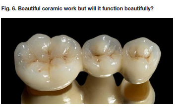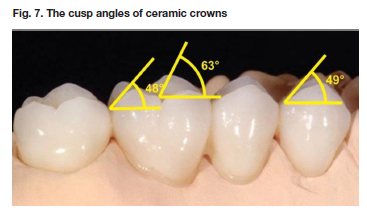 So when you see beautiful ceramic work such as in Fig. 6 and then measure the cusp angles as in Fig. 7, and look at the intricate occlusal fissuring, think about how this is going to function in the mouth. May look pretty, but it could be pretty liable to chipping and fracture under function.Finally, if you are not convinced, or even if you are, some additional evidence comes from the study of abfraction, or non-carious cervical lesions (NCCL). One study used a combination of FEA and strain gauges on artificial teeth, and found that oblique loads to the cusps resulted in tensile stresses in the cervical lesion and concluded that the pattern of stress coincided with the clinical appearance of an NCCL.18 Similar findings were reported using photoelastic stress analysis. 19