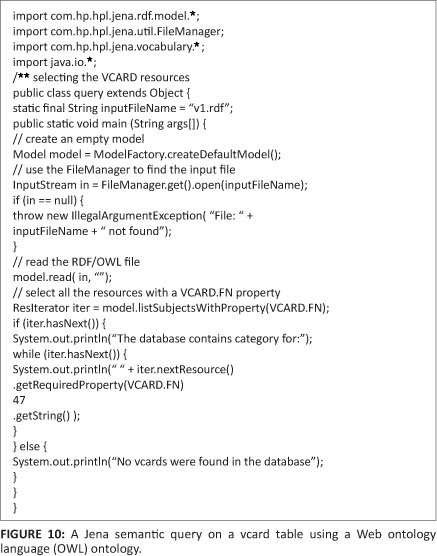 Jena APIs are used for manipulating RDF graphs and OWL files. Jena is a Java class library, and is composed mainly of APIs and SPIs (system programming interfaces). This API provides an interface for the Semantic Web application developer that makes it an ideal programming toolkit when the OWL file should be processed. In the OWL API, the key OWL package for the application developer is com. hp.hpl.jena.ontology.owl. This package contains interfaces for representing models, resources, properties, literals, statements and all the other key concepts of OWL, and a ModelFactory for creating models. Figure 10 shows a semantic query on a vcard table using OWL ontology built from Phase 1.