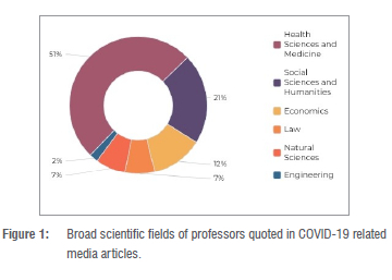 In terms of the field of expertise, we showed that voices from health sciences and medicine dominated and were present in 51% of the media content we analysed. However, we found that expertise from the social sciences was present in about one-fifth of the articles (21%) and was therefore not completely sidelined as feared by Bavel et al.29 Notably, Connell60 suggests that COVID-19 is a social emergency as much as a medical one, and Brossard (quoted in Lohwater61) points out that, with an issue as heavily politicised as COVID-19, we need expert guidance that goes beyond the medical sciences. Lohse and Canali28 point out that social science expertise is needed to ensure sufficient attention to social issues, to identify gaps in policy, and to offer a more fine-grained harm-benefit analyses of different policy options. Soudien62 highlights the importance of social science expertise to deal with the social trauma brought about by the pandemic, and outlines the work done by social scientists in South Africa - through research and grassroots involvement - during this public health crisis. Social scientists can help policymakers and colleagues from health and natural sciences to develop solutions that people are able and (crucially) willing to follow.63,64 Political scientists could, for example, play a major role in terms of the pandemic response based on their knowledge of public risks and the role of governments.28 Communication scientists know how to build public trust through credible public communication, which includes acknowledging uncertainty.65,66