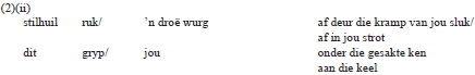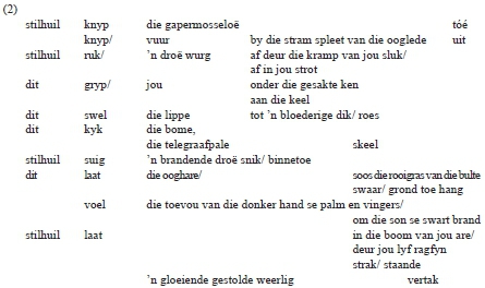 Soos die "knyp [...] tóé" en "knyp [...] uit" in (2)(i), is die "ruk [...] af' en "gryp[...] onder/aan" in die bostaande konstruksie eweneens handelinge wat met krag en geweld uitgevoer word. Die fokus verskuif vanaf oë na sluk, strot en keel en die indringing in die liggaam word in die eerste plek omlyn deur die parallelle preposisionele frases "af deur die kramp van jou sluk/ af in jou strot". Die pynlike moeisaamheid van die aksies word versterk deur beskrywende woorde soos "droë" en "kramp". Die laaste aksie is duideliker benouend-gewelddadig as die objek skielik "jou" is wat "aan die keel" gegryp word.