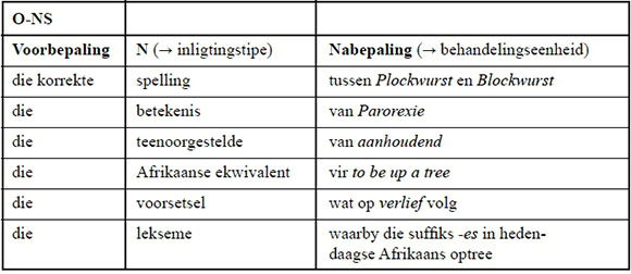 Die waarde van die illokusie-formulering van gebruikersituasievrae is dat die waarskynlike toegangselement tot die antwoord op die gebruikersvraag sowel as die aard van die antwoord bepaalde sintaktiese posisies inneem. As die proposisionele funksie p in ?(p) in navolging van Searle (1969:31) as 'n (elliptiese) stelsin geformuleer word, bevat die onderwerpsnaamwoordstuk (O-NS) die twee komponente wat tot die antwoord op die vraag lei in 'n bepaalde struktuur: (1) Die kernnaamwoord (N) impliseer die aard van die gesogte inligting en by uitbreiding die omvang van die versameling moontlike mikrostruktuurelemente wat die leksikografiese boodskap met die antwoord op die gebruikersvraag sal bevat; (2) die nabepaling bevat die waarskynlikste spesifieke behandelingseenheid wat die gebruiker sal opsoek om die gebruikersvraag te beantwoord, of dit kan daarvan afgelei word.