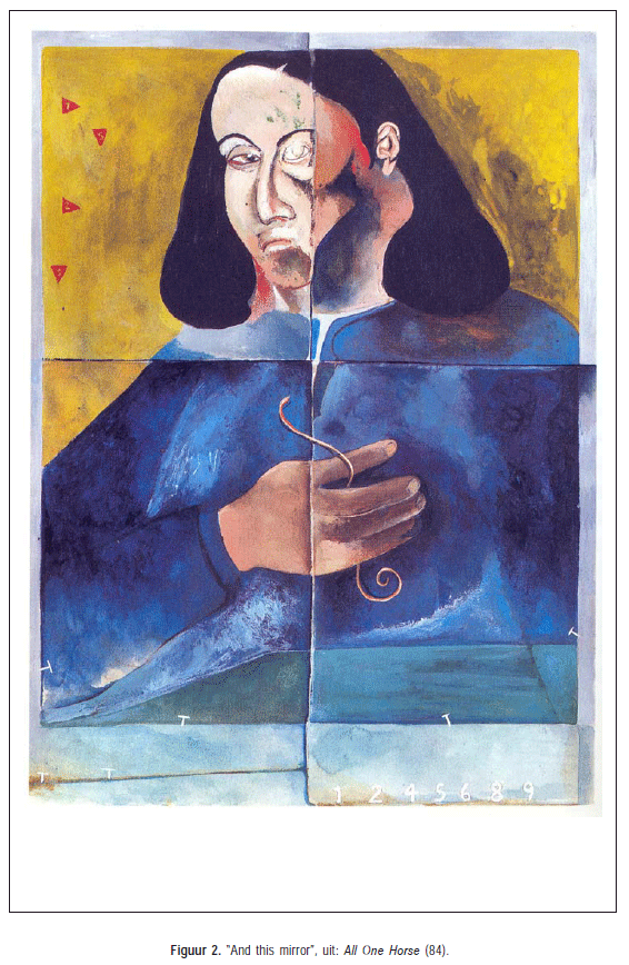 Die skildery is, soos dikwels, in vier dele gedeel en die twee oë van die reeds verdeelde gesig, lyk glad nie dieselfde nie, nòg in kleur nòg in vorm. In 'n ander skildery in All One Horse (32) is daar 'n skilderende figuur wat 'n soort selfportret skilder waarin die een oog oop en die ander toe is. Dit is dus 'n soort gelaagde metatekstuele skildery waarin die skilderhandeling uitgebeeld word, maar die afbeelding binne die skildery is tegelykertyd 'n spieëlbeeld en geen spieëlbeeld nie, want die oë korreleer nie en is oorkruis oop en toe. Uit elke toe oog drup 'n groot traan en bokant die twee gesigte, van die uitgebeelde skilder en die geskilderde gesig binne die skildery, hang 'n oog teen die muur wat effens oop is en waaruit daar ook 'n traan drup, maar hierdie oog lyk ook soos 'n mond. Skilder en skryf, kyk en praat, nie kyk nie en nie praat nie, die uitwissing van kyk én van praat, die selfbewuste aanhangig maak van sowel kyk as praat as handelinge, as prosesse op sigself én as betekenisgenererende en representerende prosesse, word dus herhaaldelik in verskillende kombinasies aan die orde gestel.