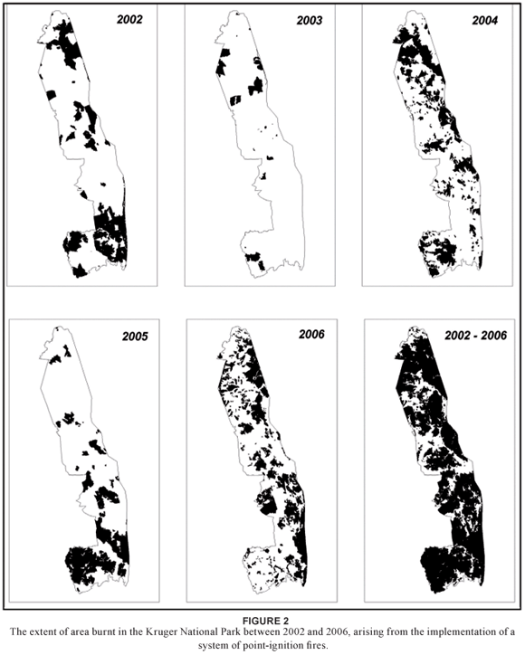 Since the proclamation of the park, fire management has passed through a number of phases (see Van Wilgen et al. 2004 for details). These included occasional but limited deliberate burning; attempts to reduce the impacts of fire; both regular and more flexible prescribed burning; and a "natural" fire policy, in which all lightning-ignited fires were allowed to burn freely, while at the same time attempts were made to prevent, suppress or contain all other fires. During the 1990s, a set of seven fire-related thresholds was proposed, with the aim of monitoring and assessing the fire regimes resulting from the natural fire policy that was in place at the time (see Table 1).