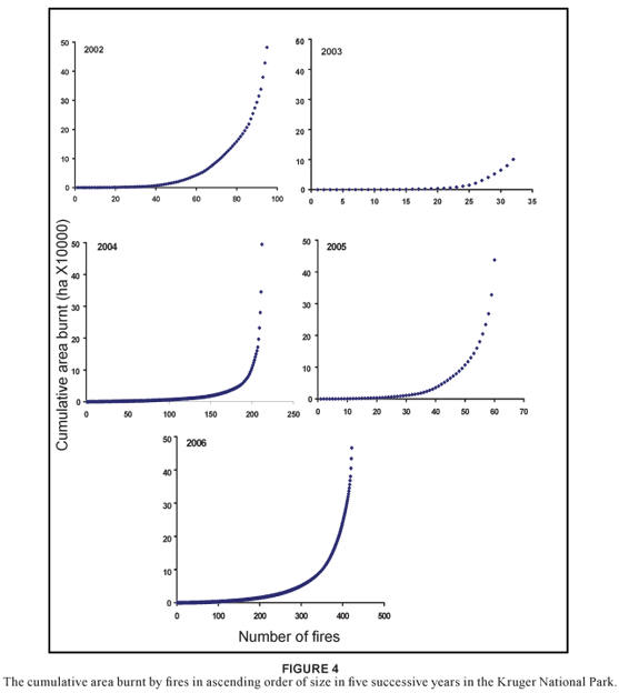 The fire regime that was established under the new approach in the park was dominated by very large (> 5 000 ha) fires (see Tables 2 and 3, Figures 3 and 4). Between 2002 and 2005, these very large fires accounted for between 81 and 88% of the area burnt; only in 2006 did the area burnt in very large fires fall to 52%. In 2002, 2004 and 2005, large fires dominated from early on in the fire season; it was only in 2006 that smaller fires of between 50 and 5 000 ha were able to burn > 30% of the total area in one year (see Figure 3 and Table 2). The relative dominance of large fires is illustrated by comparison to the patch burning system implemented in the Pilanesberg National Park (Brockett et al. 2001). The number of fires needed to complete annual burning programmes in Pilanesberg (50 000 ha in extent) ranged from 9 (following a dry year, total rainfall 393 mm) to 71 (following a wet year, total rainfall 813 mm). By comparison, the Kruger National Park completed annual burning programmes with between 0.8 and 8.5 fires for every 50 000 ha of the park (see Table 2), an order of magnitude difference. The relatively small size of the Pilanesberg Park, as well as a somewhat higher mean annual rainfall (630 mm) may have contributed to management's ability to introduce a much finer patch burning scale.