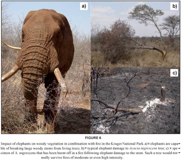 Concern has been expressed about declines in large trees in the Kruger National Park. These declines are at least in part due to fire, and interactions between fire and herbivory by elephants (Eckhardt et al. 2000, Edkins et al. 2007). The exclusion of one of either fire or elephants, and the presence of the other, both result in the dominance of large trees; the co-occurrence of both apparently erodes the number of large trees (Van Wilgen et al. 2003). Elephants do considerable damage to woody vegetation, and increase the susceptibility of trees to damage during fires (see Figure 6). It is therefore tempting to consider either the manipulation of fire regimes, or reductions in elephant numbers, as possible means of slowing or preventing declines in large trees in the presence of elephants. However, there are a number of underlying principles that need to be considered before such interventions can be proposed (Owen-Smith et al. 2006). These include: (i) the absence of a benchmark against which to judge an "ideal" vegetation state for the park; (ii) the possibility that large trees present today may have established during a time when elephants had been eliminated from the area as has happened elsewhere (Dublin et al. 1990), and which is itself an unnatural situation; and (iii) the fact that observed declines in large trees took place despite limiting the elephant population through culling for over three decades. Owen-Smith et al. (2006) also point out that manipulation of one component of an ecosystem is likely to be ineffective because poorly understood feedbacks are not taken into account and that "perpetual tinkering" to meet aesthetic objectives should be avoided. There is also growing recognition that ecosystems are in a state of flux (Rogers 2003) and that stable or semi-stable states are both unattainable and undesirable. Owen-Smith et al. (2006) have proposed that thresholds for the maintenance of tree populations need to be made spatially explicit, for example so that the elimination of large trees can be tolerated in some areas as long as they survive in others. Clearly, the issue of interactions between fire regimes, herbivory and other factors requires better understanding if concrete recommendations about the use of fire are to be made.