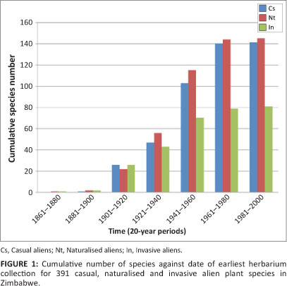 CONSERVATION IMPLICATIONS: This research provides baseline information and historical invasion patterns of casual, naturalised and invasive alien flora in Zimbabwe. This inventory is a crucial starting point in trying to understand and initiate the management of biological invasions. This is also important for monitoring new introductions and management of existing alien plants in Zimbabwe.