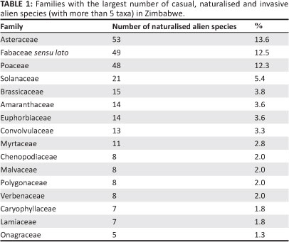 The taxonomic composition of the alien flora of Zimbabwe is not random and families with the largest number of species belong to the largest families worldwide, for example Asteraceae, Poaceae and Fabaceae. A number of taxa belonging to these families and those of Amaranthaceae, Caryophyllaceae, Chenopodiaceae and Solanaceae have been recorded as weeds of agroecosystems in Zimbabwe (Drummond 1984; Wild 1955). Heywood (1989) examined the patterns and extent of invasions by agricultural weeds and concluded that most weeds come from the largest plant families like the Asteraceae and Poaceae. Thus, it is also not surprising that annuals and herbaceous perennials are the prevalent life forms amongst the alien flora recorded in this study, as it has been shown in other studies that the herbaceous habit is most frequent amongst the invasive species (Daehler 1998; Kolar & Lodge 2001).