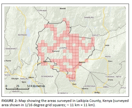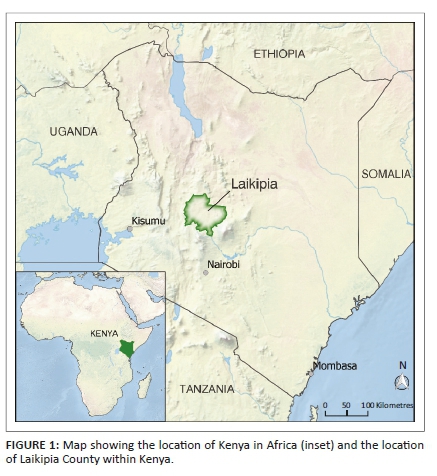 Approximately 9500 km2 in extent, Laikipia County in central Kenya is a mix of grasslands, savanna woodland and forest, lying between the Aberdares Range (4000 m asl) to the south and southwest, Mount Kenya (5200 m asl) to the east and southeast, Eastern (Gregory) Rift Valley (c. 970 m asl) to the west, Karisia Hills (2580 m asl) to the northwest, Mathews Range (2688 m asl) to the north and Buffalo Springs National Reserve and Samburu National Reserve (c. 900 m asl) to the northeast (Butynski & De Jong 2014; Figure 1).