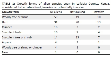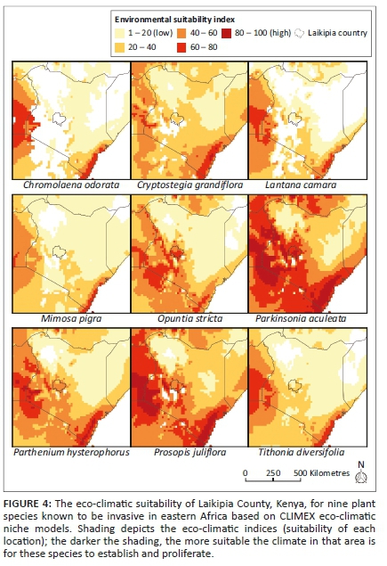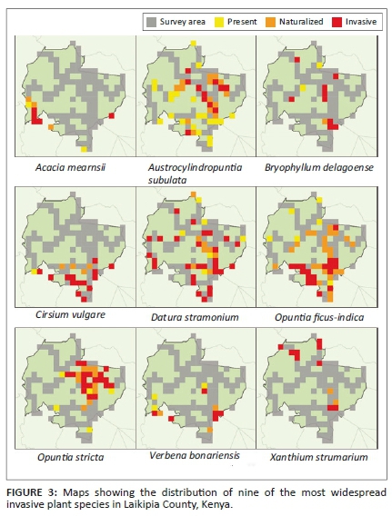 The first step in facilitating the management of these invasive alien plants is to gain a better understanding of their presence, distribution and impacts (Shackleton et al. 2017a, 2017b, 2017c; Witt et al. (2018). Here, we report on the naturalised, invasive and potentially invasive alien plant species in Laikipia County, Kenya, one of the most important multiple-use conservation areas in eastern Africa (Sundaresan & Riginos 2010). Despite only 2% of the land in Laikipia having been set aside exclusively for wildlife conservation (Georgiadis et al. 2007), the county is home to the second highest abundance of wildlife in East Africa, after the Mara-Serengeti ecosystem, and hosts the highest populations of endangered large mammals in Kenya, including half of the country's rhino population, together with significant populations of elephants, Grevy's zebra, reticulated giraffe and wild dogs (Sundaresan & Riginos 2010). In fact, the county is home to a higher diversity of large mammals than either the Serengeti National Park in Tanzania or KNP in South Africa (Sundaresan & Riginos 2010), with the highest diversity of large mammal species of similar size anywhere in the world (Butynski & De Jong 2014). Of the 62 large mammal species present in the county, one is 'critically endangered', two are 'endangered', four are 'vulnerable' and six are 'near threatened' (Butynski & De Jong 2014). Moreover, 50% of Kenya's bird species (i.e. more than 560 species) have been recorded in Laikipia (Butynski & De Jong 2014). The only known previous study on the naturalised and invasive plants present in this county was a field guide produced by Witt (2017), which did not include any detailed analyses of the data collected. Other studies on invasive plants conducted in the area focussed on the invasion of Opuntia stricta (Haw.) Haw. (Cactaceae) (Strum, Stirling & Mutunga 2015) or the associated impacts of O. stricta invasion (Dudenhoeffer & Hodge 2018; Dyck 2017). We provide a list of naturalised and/or invasive alien plant species recorded in Laikipia and include alien plant species present that are known to be naturalised or invasive elsewhere in the world, but have not been recorded as such in Laikipia at the time of the survey. We also provide distribution data, based on roadside surveys, for the most invasive species. We also assess the eco-climatic suitability of Laikipia to invasions by some of the worst invasive alien plant species in eastern Africa, a few of which are already present in Laikipia. This information will be useful in prioritising species for management to protect biodiversity and enhance livelihoods.