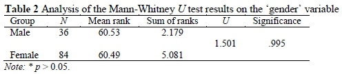 In order to provide an answer to the second research question, Table 2 presents the analysis of the Mann-Whitney U test conducted to determine the effect of the 'gender' variable.