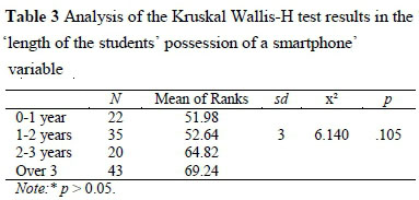 In order to answer this, Table 3 presents the analysis of the Kruskal Wallis-H Test conducted to determine the effect of "the length of the students' possession of a smartphone" variable.