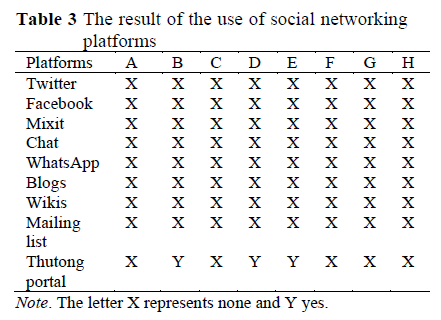 The participants were asked how they used social networking tools for teaching and learning. To ease the sharing of information, the participants were provided with examples of social networking tools, namely, Twitter, Facebook, Mixit, Chat, WhatsApp, blogs, Wikis, mailing lists and the Thutong portal. The findings show limited knowledge of such platforms.